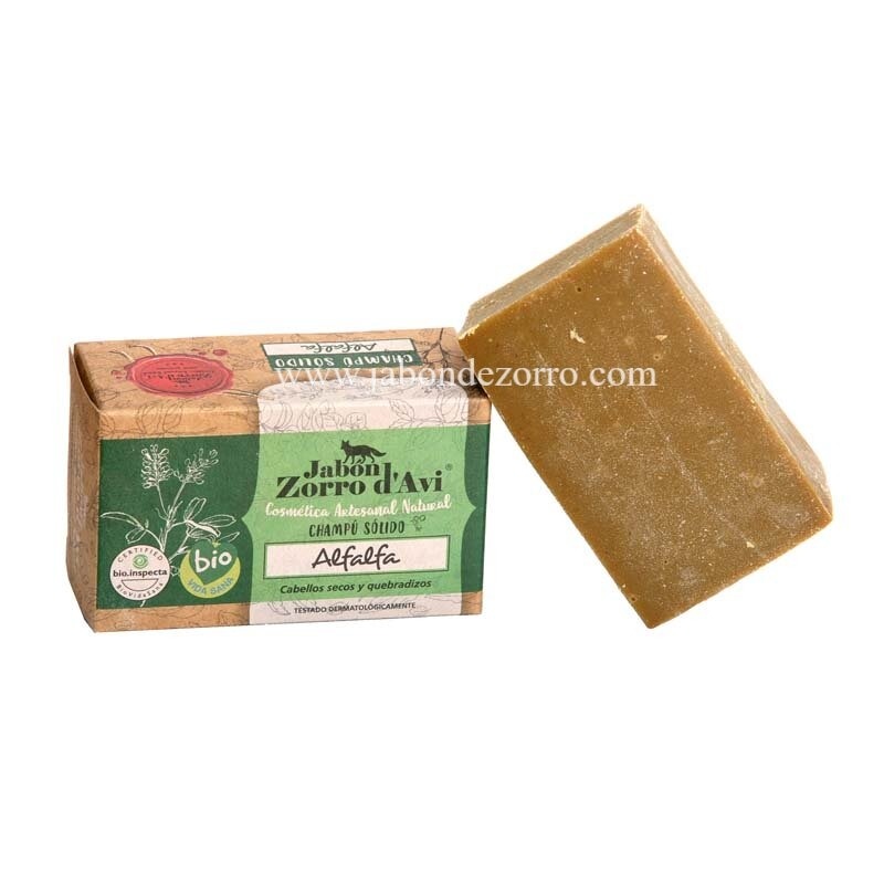 Elaboración. Champú sólido artesanal natural elaborado con aceite de oliva ecológico de calidad superior obtenido mediante procedimientos mecánicos y alfalfa (Medicago sativa). No contiene ingredientes derivados de animales. Libre de parabenos, colorantes, conservantes y aromatizantes. Exento de aceites minerales derivados del petróleo. Producto biodegradable respetuoso con el medio ambiente. No testado en animales.