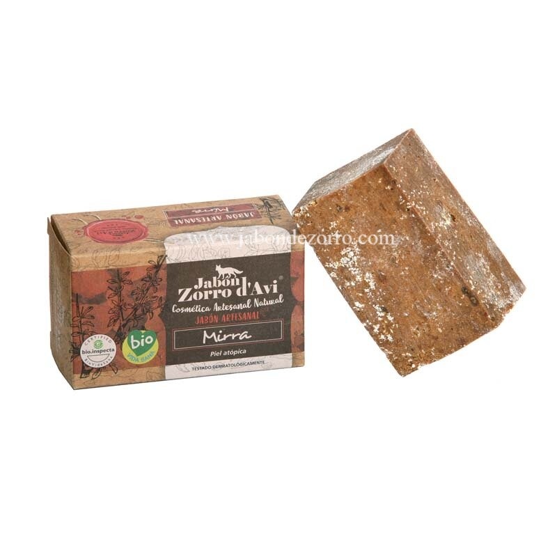 Elaboración. Jabón artesanal natural elaborado con aceite de oliva ecológico de calidad superior obtenido mediante procedimientos mecánicos y mirra (Commiphora myrrha). No contiene ingredientes derivados de animales. Jabón libre de parabenos, colorantes, conservantes y aromatizantes. Exento de aceites minerales derivados del petróleo. Producto biodegradable respetuoso con el medio ambiente. No testado en animales.