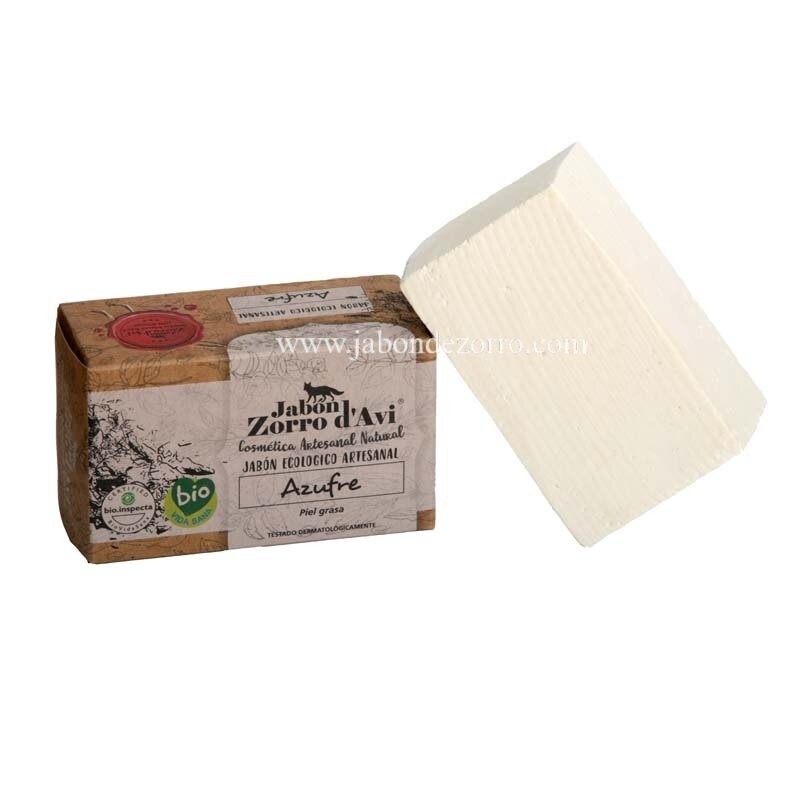 Elaboración. Jabón de azufre ecológico artesanal elaborado con aceite de oliva ecológico de calidad superior obtenido mediante procedimientos mecánicos y azufre procedente de manantiales de aguas sulfurosas. No contiene ingredientes derivados de animales. Jabón libre de parabenos, colorantes, conservantes y aromatizantes. Exento de aceites minerales derivados del petróleo. Producto biodegradable respetuoso con el medio ambiente. No testado en animales.