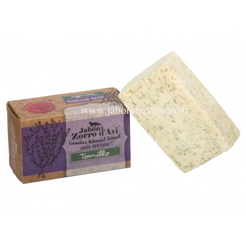 Elaboración. Jabón artesanal elaborado con aceite de oliva de calidad superior obtenido mediante procedimientos mecánicos y tomillo (Thymus vulgaris). No contiene ingredientes derivados de animales. Jabón libre de colorantes, conservantes y aromatizantes. Exento de aceites minerales derivados del petróleo. Producto biodegradable respetuoso con el medio ambiente. No testado en animales.